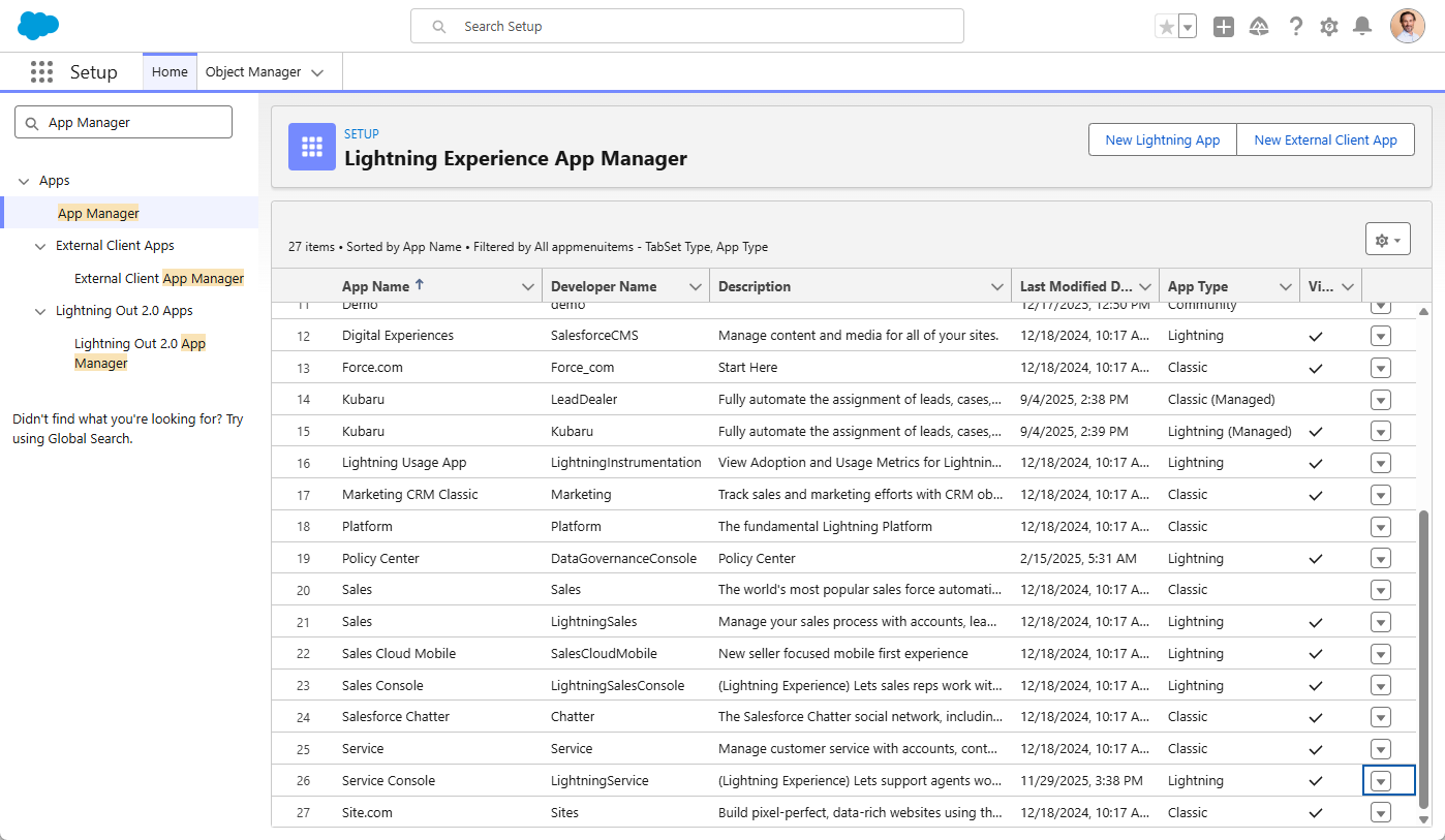 - In Setup, search for App Manager.