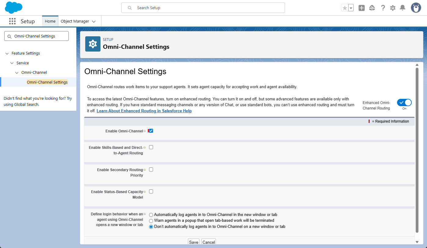 - In the Setup Quick Find box, enter Omni-Channel Settings and select it.