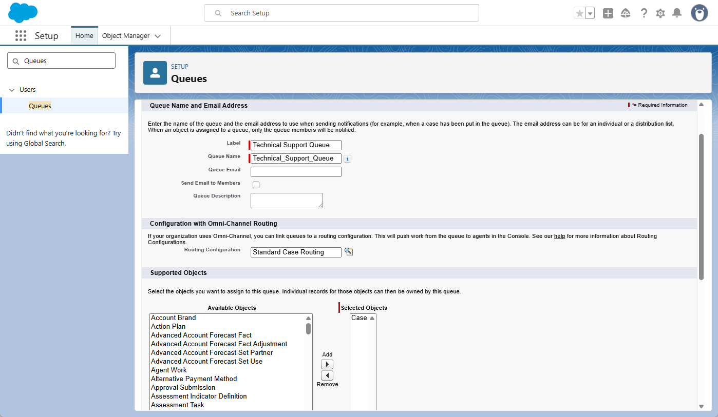 Case) and move it to the Selected Objects list. - Queue Members: