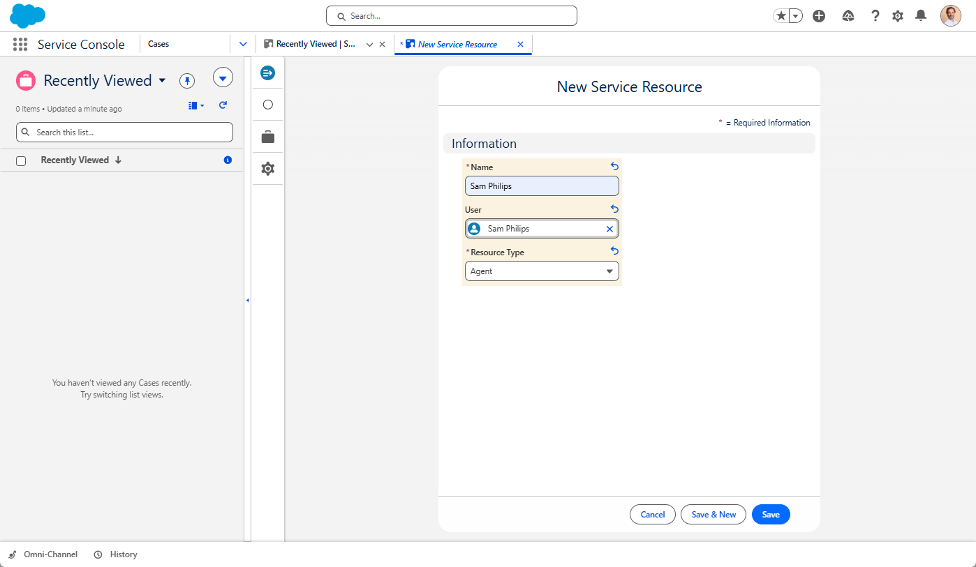 A Service Resource record officially designates a user as an agent who is eligible to receive work. Without this record, agents will not appear in the Omni Supervisor dashboard, and work cannot be routed to them.