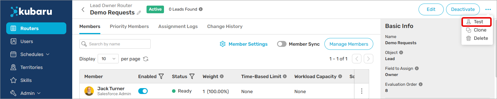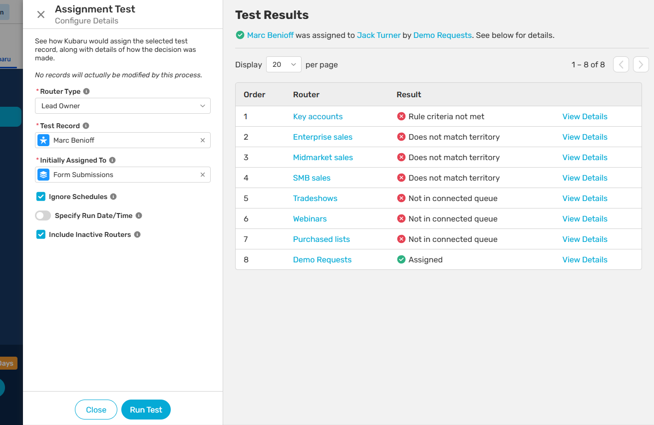 The Assignment Test feature lets you preview how Kubaru would assign a specific record—without actually making any assignments. It’s a great way to troubleshoot your router configuration or validate your setup before going live.