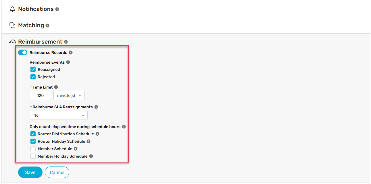- If Reassigned is checked, you can specify whether automatic reassignments qualify for reimbursement using Reimburse SLA Reassignments. We do not recommend enabling this, as it can lead to a reimbursement loop if a recipient is consistently not working their records.