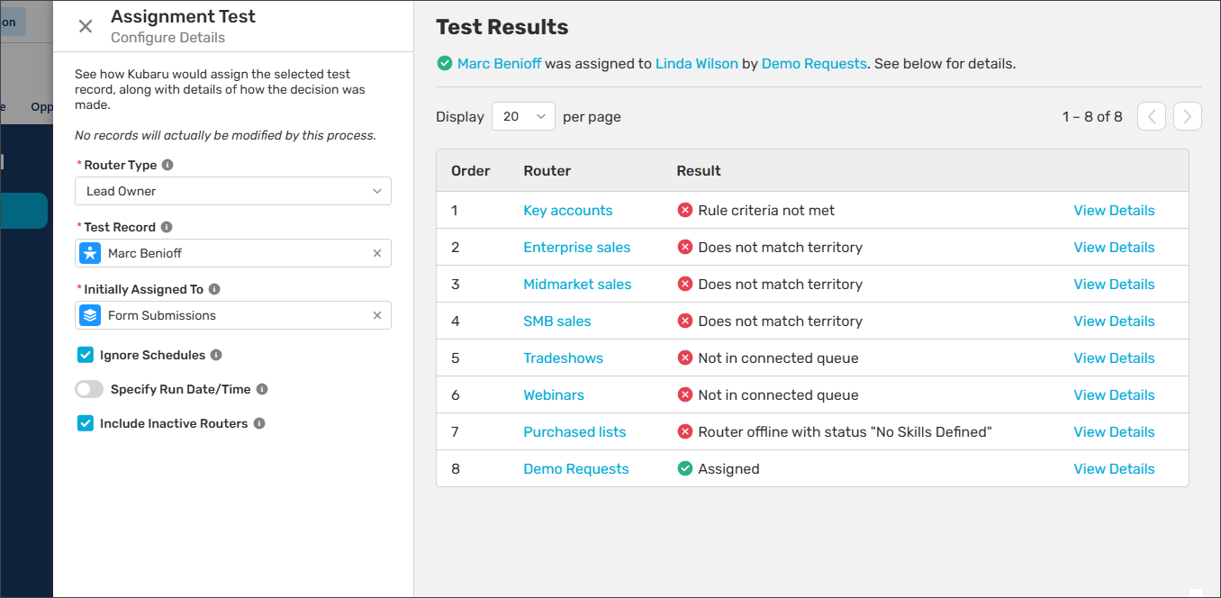 - Assignment Test: Ensure your routing logic is airtight by simulating record assignments. Each test generates a comprehensive decision path log, providing full transparency into the routing logic to help you troubleshoot and optimize your assignment strategy without affecting live data. See Assignment Test for more information.
