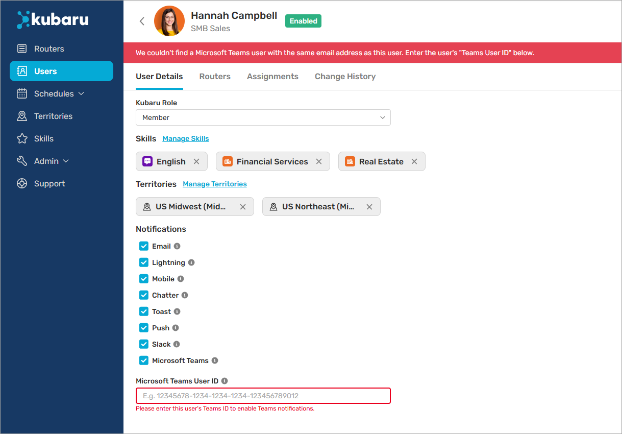 You will receive the following error if Kubaru is unable to locate a Microsoft Teams user based on their email address.