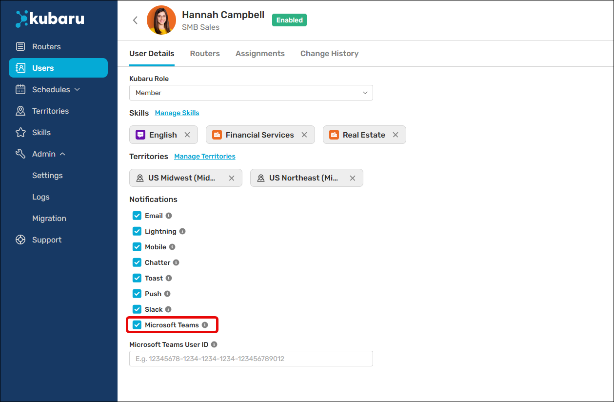 - Confirm Microsoft Teams Notifications is set to “Enabled” or “Enabled (users can override)”. Note: if you set this to “Enabled (users can override)”, your users will be able to disable these notifications in the Kubaru Utility.