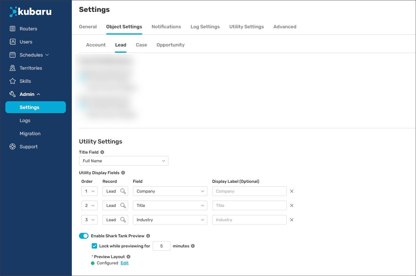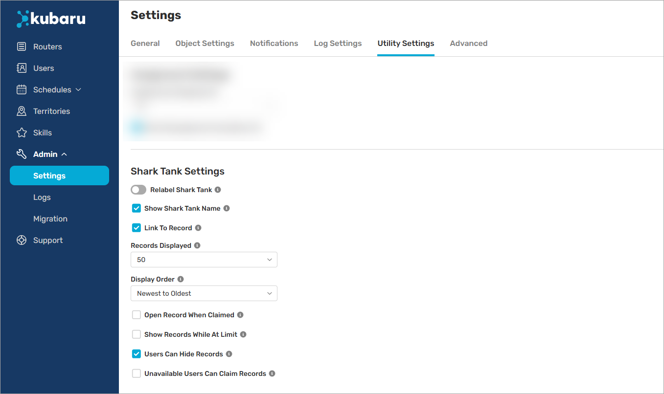 The following settings are related to the Shark Tank tab of the Kubaru Utility. These settings can be found by navigating to the Kubaru application, expanding the Admin tab in the navigation, clicking Settings, and clicking Utility Settings.
